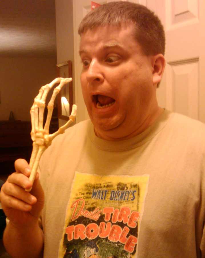(More frightening than the skeleton hand: whatever the hell’s going on with my neck in that photo.)